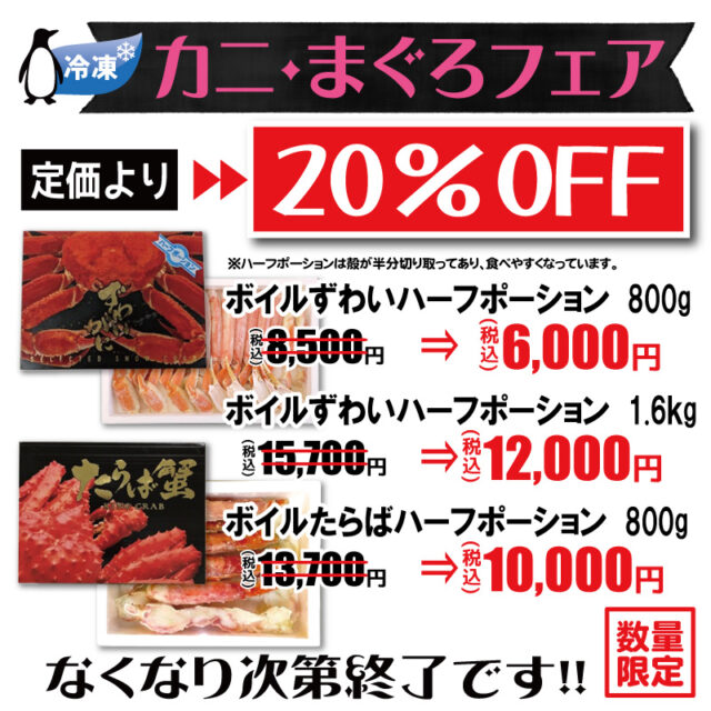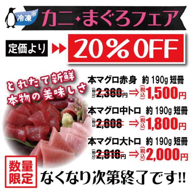 数量限定ですが、冷凍のカニ・マグロがお安くなっています。