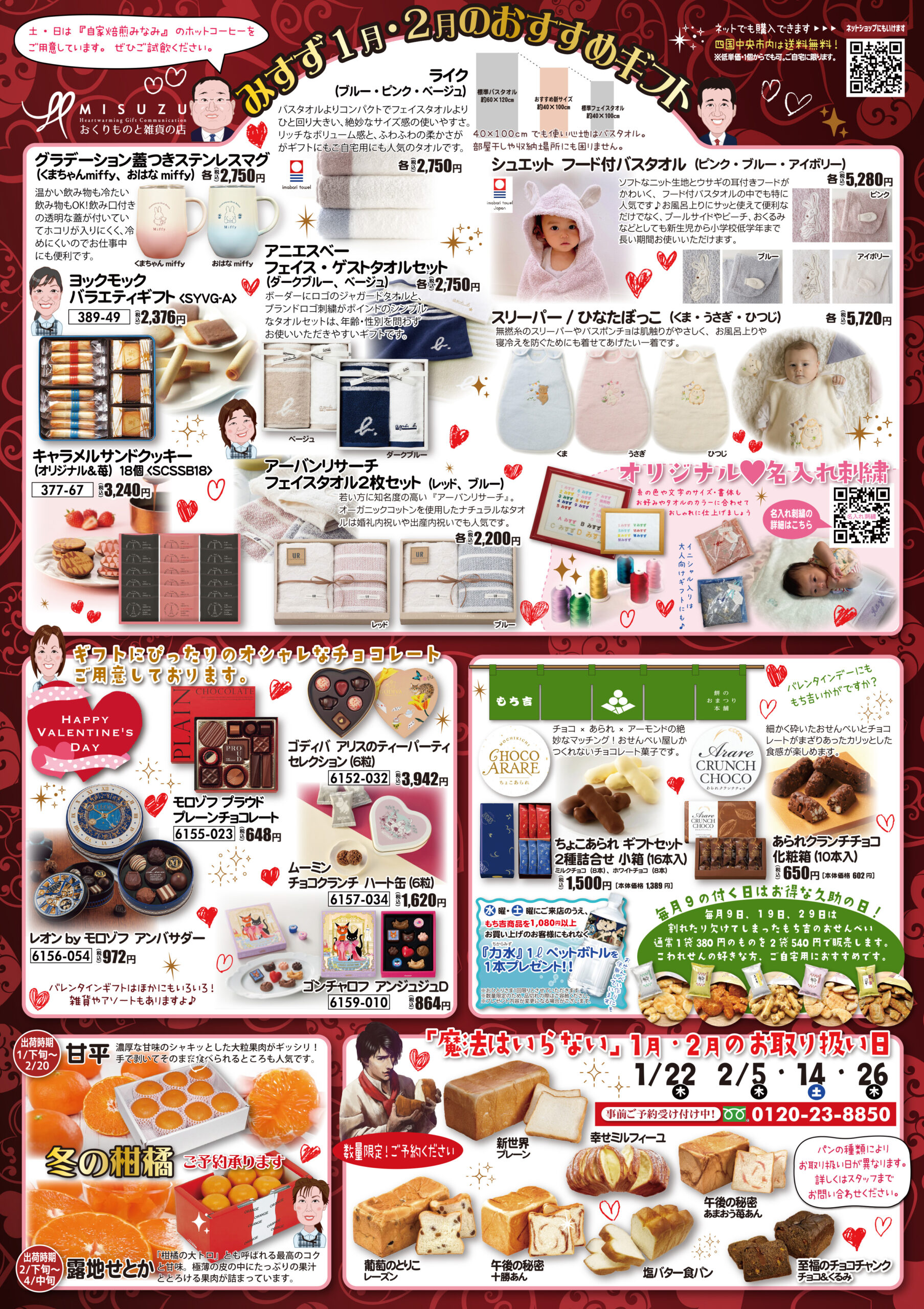 今回のチラシでは、おすすめの出産祝いなどのご案内やバレンタインデーに入荷するチョコレート、もち吉、魔法はいらないなどのインフォメーションを掲載しております。